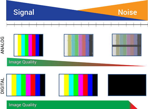 Power supply noise, signal attenuation, and cable reflections all degrade image information transmitted over analog video formats. The susceptibility of analog video to noise is rooted in the time and amplitude encoding of the image information. Any interference that changes the signal timing or amplitude directly affects the picture. With digital video, as long as the binary bit pattern can be reconstructed, the original image information can be perfectly reproduced. This is why subjective image quality in analog video gradually transitions from good to bad as the signal-to-noise ratio decreases, whereas with digital video the transition from good to bad is nearly a step function: it either works or it does not.