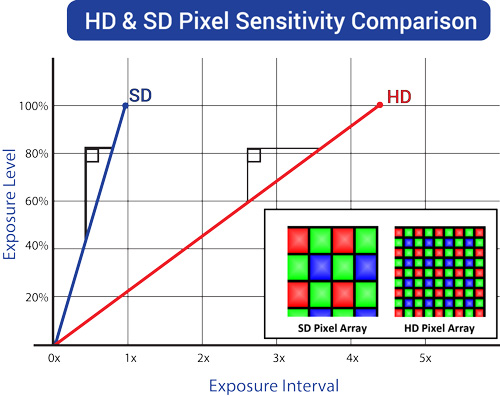 The term “High Definition” refers specifically to the resolution of an image – for a given optical format of image sensor, higher resolutions are achieved by dividing the image sensor area into more, smaller, individual sensing areas or pixels. Typical image sensors operate on the same basic technologies regardless of their resolution and as a result have very similar performance per unit area. The reduced sensing area of smaller pixels results in proportionally reduced light sensitivity and poorer signal to noise ratio compared to the larger pixels of an equivalent size but lower resolution sensor.