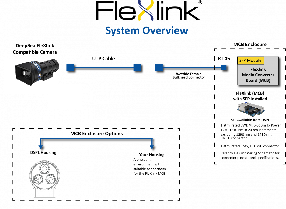Our exclusive FleXlink® technology is a cost-effective and robust alternative to coaxial and fiber optic interconnects in subsea HD and 4K/UHD video transmission. FleXlink uses reliable unshielded twisted pair (UTP) conductors and readily available Ethernet-type interconnectors to reduce infrastructure cost and solve common problems with subsea HD/4K camera integration.