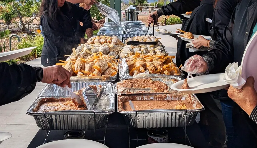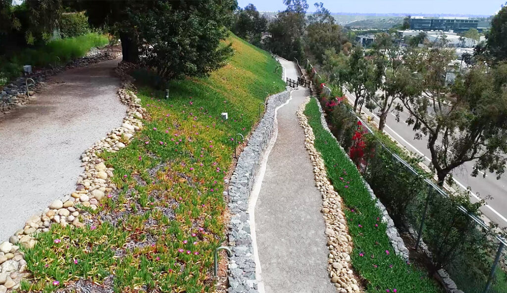 An outdoor path meanders through shaded seating areas, fruit trees, and a panoramic view of the nearby canyon.